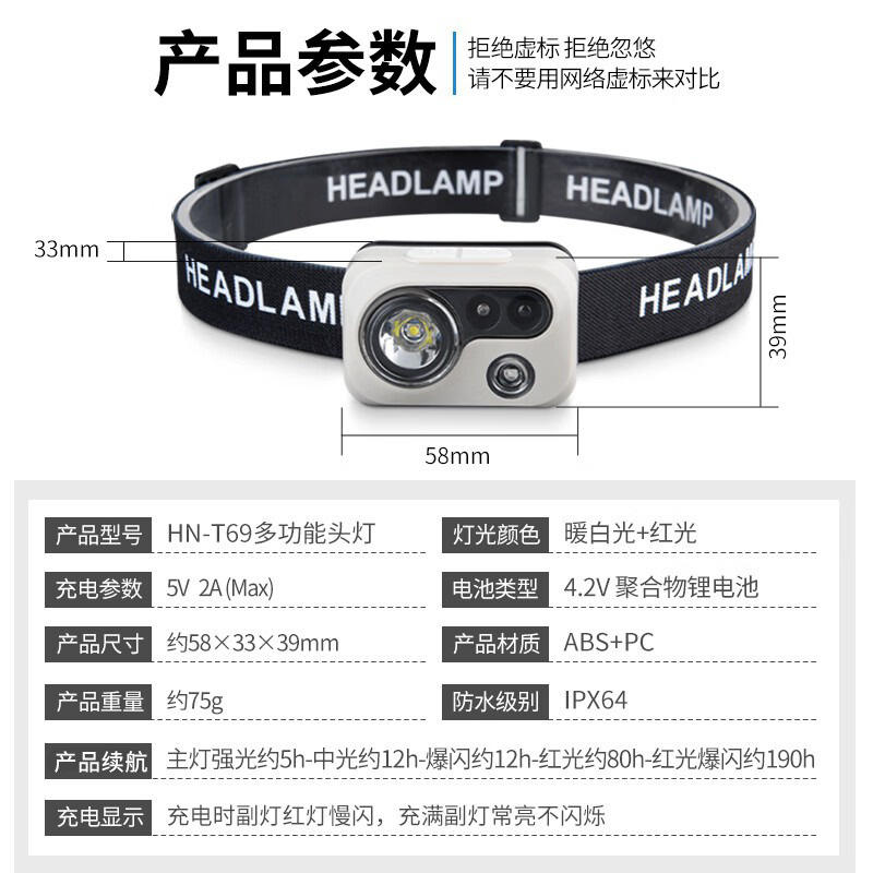 Lampe frontale HN-T69, lumière LED rechargeable 2000mAh pour la pêche de nuit, la randonnée, le camping, la spéléologie, la patrouille