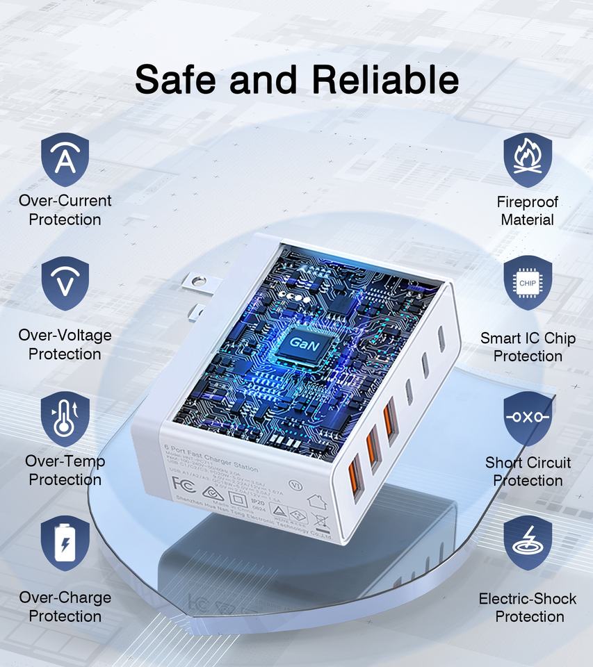 Chargeur multifonctionnel HNT au prix d'usine, GaN 100W, 6 ports, portable, PD20W, QC18W, charge rapide de voyage, type C, pour iPhone