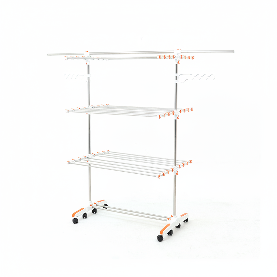 Dispositif:Foldable structure, 6 tier vertical design, Large drying capacity, Rolling wheels with lock, Space saving storage, Stable metal frame, Easy to move and use