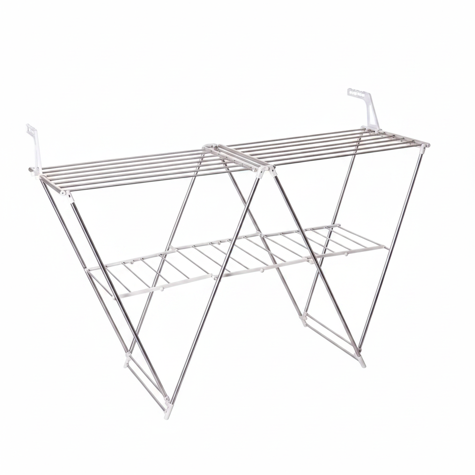 Dispositif:Foldable W shaped design, Two tier drying structure, Durable stainless steel frame, Wide drying area, Smooth rounded finishing, Easy storage and setup, Large drying capacity