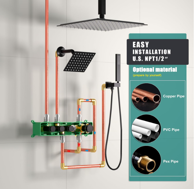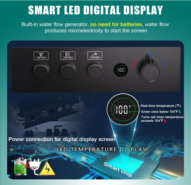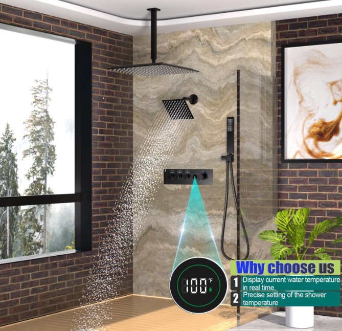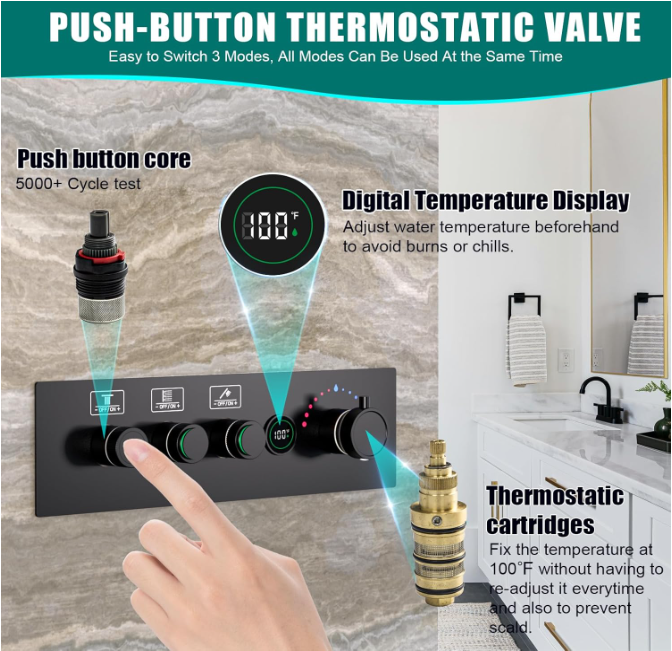Système de douche à effet pluie double HONGDEC 16" + 6", robinet thermostatique à bouton-poussoir avec affichage de la température