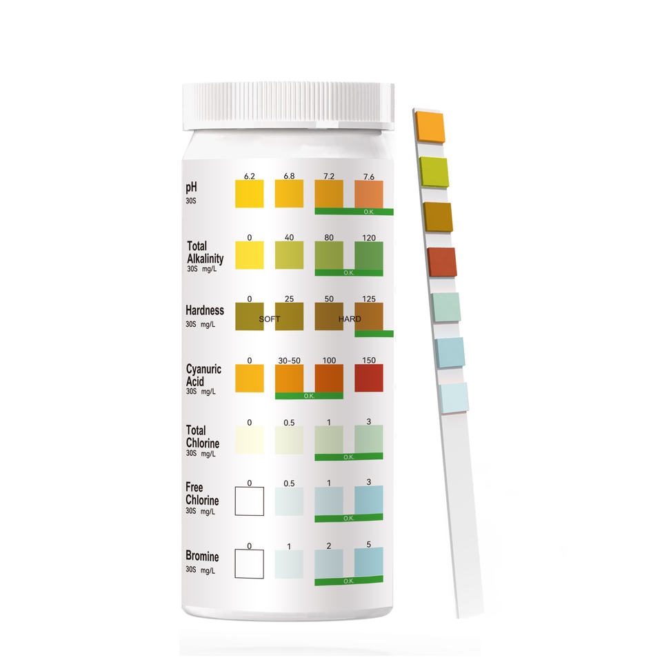 PH, Total Chlorine, Free Chlorine, Alkalinity, Hardness, Cyanuric Acid, Bromine