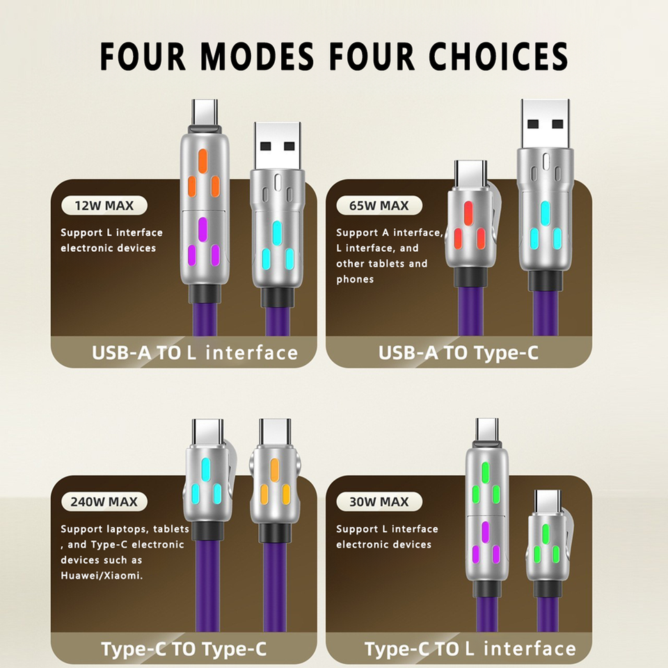 Câble USB C HOT Chubby 240W 4-en-1 de 2 m, USB A/C vers C/Lightning avec lumière pour téléphones Apple 17 16 15 14 Pro Max