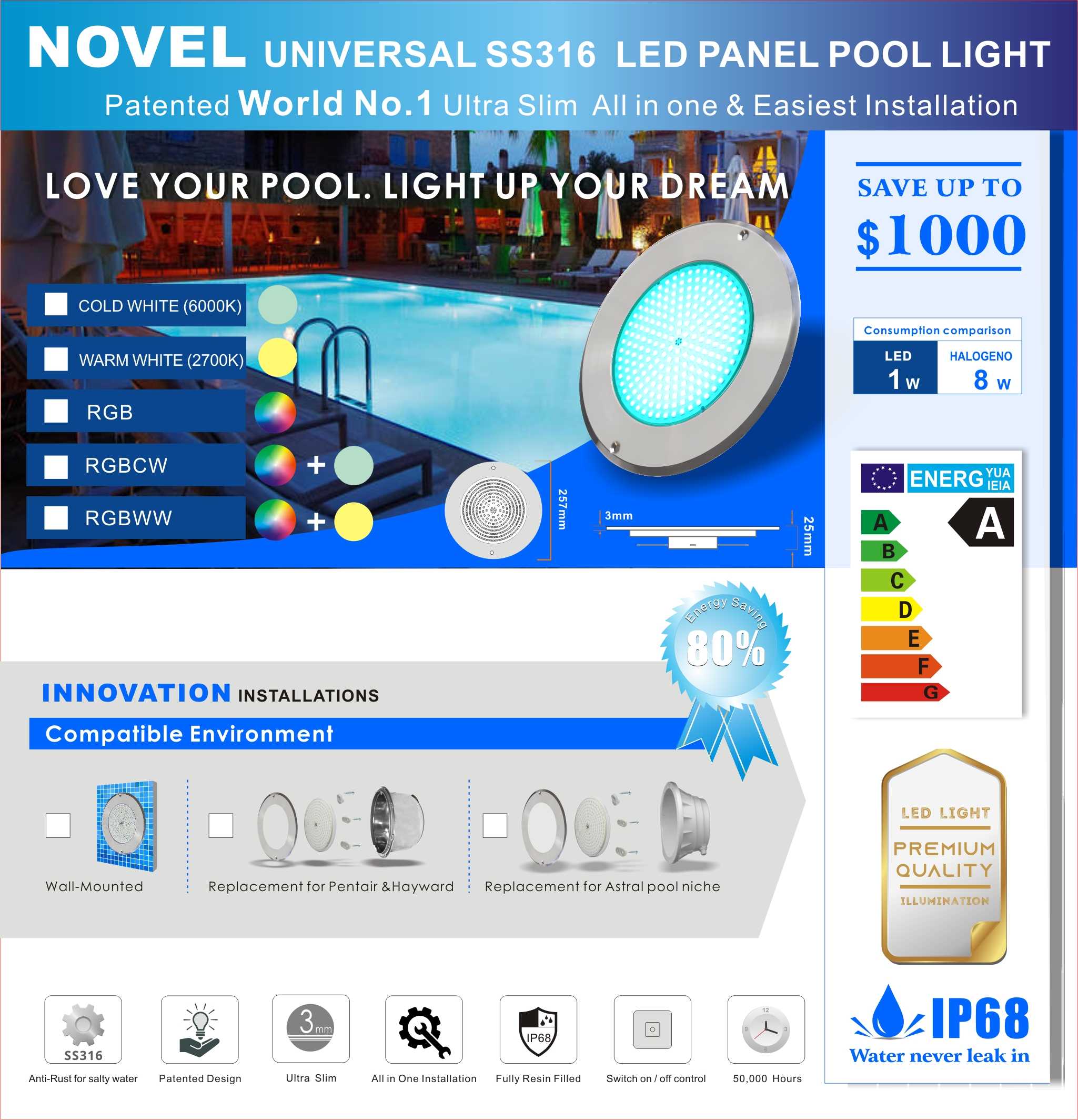 Installation:Pour Pentair et Hayward OU Astra Niche/Mur monté