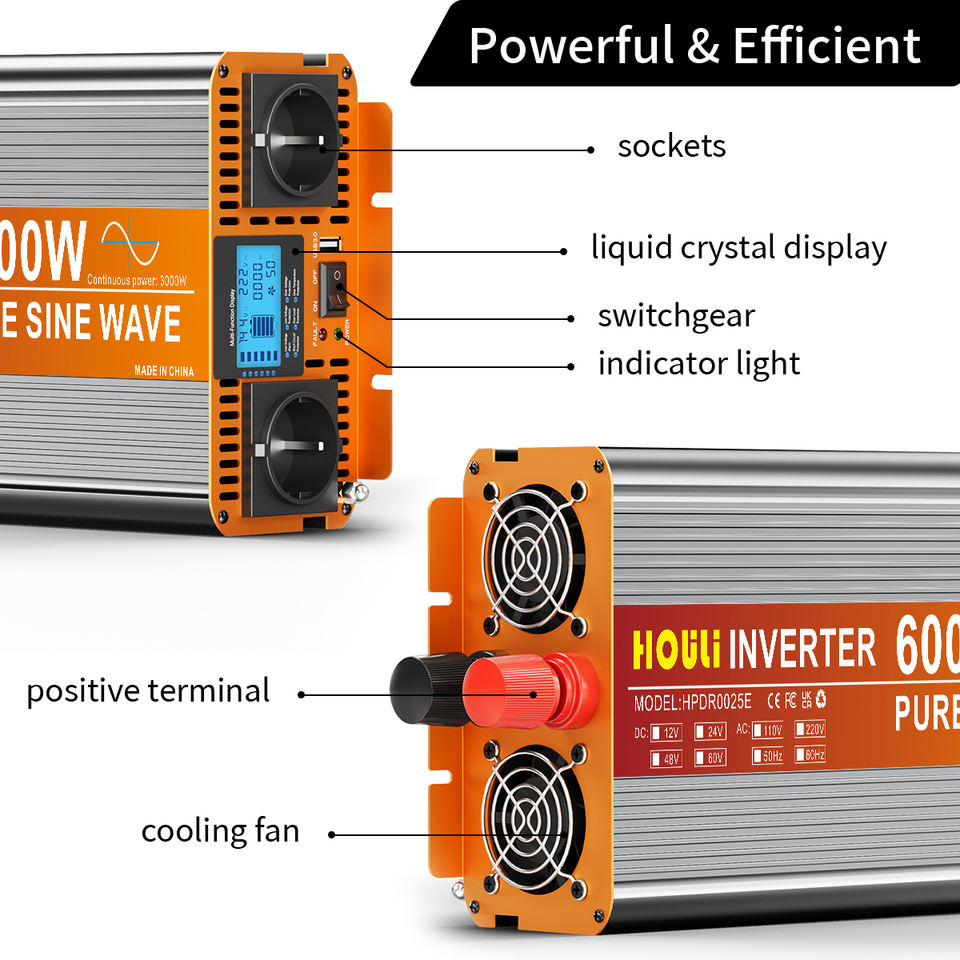 Convertisseur d'énergie monophasé à onde sinusoïdale pure HOULI 3000W~7000W | Convertisseur 12V/24V DC vers 220V AC pour voiture, camping-car, système solaire