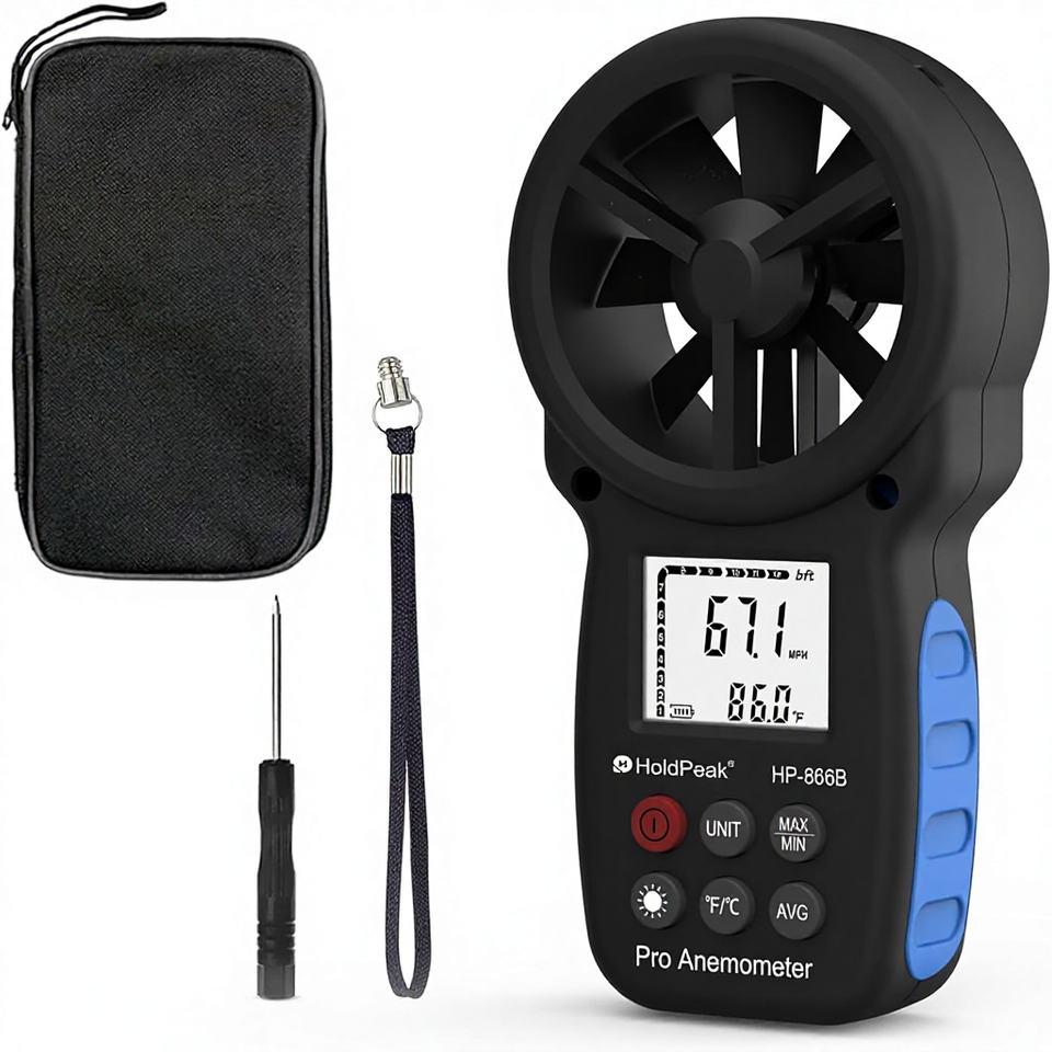 Anémomètre numérique portable HP-866B – Mesure de vitesse du vent (MPH, Beaufort), température, sensation de froid, rétroéclairage, max/min