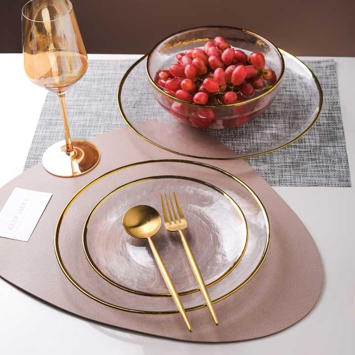 Assiette ronde en verre transparent écologique HYC-PL04 avec bord doré pour banquets de mariage et dîners en vente