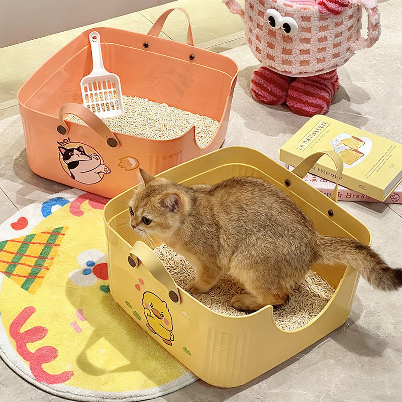 Bac à litière ouvert rectangulaire à rebord haut Ha Gou, bac à litière manuel pour chat avec pelle, portable pour chats adultes