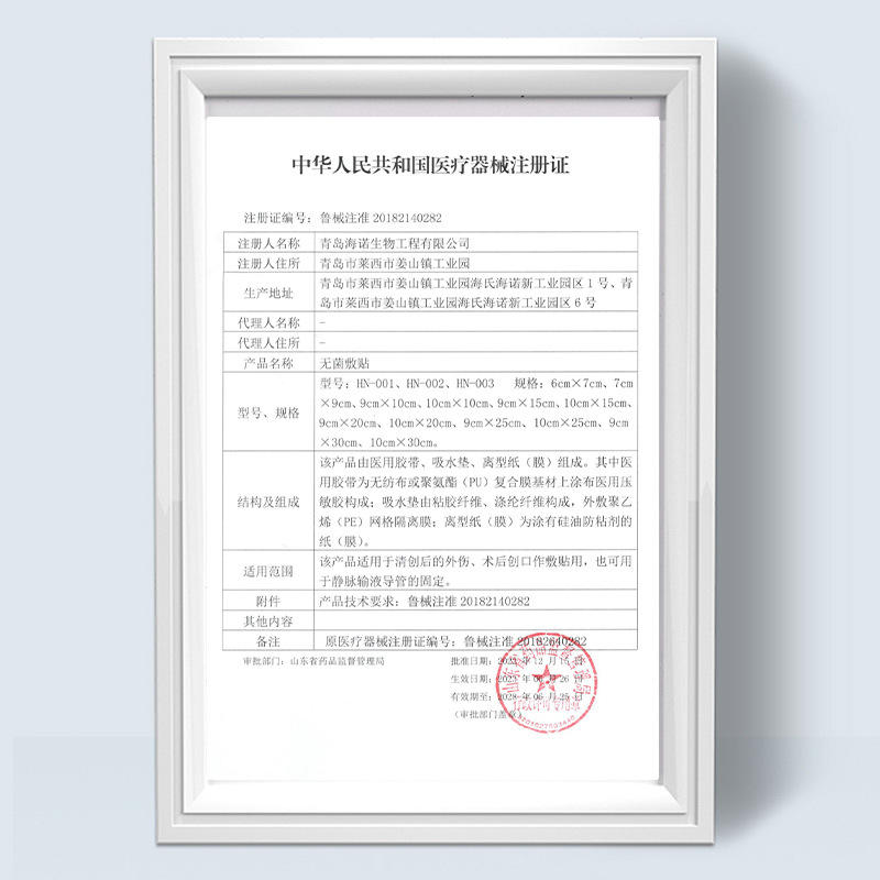 Numéro d'approbation du médicament (dispositif médical):Certificat d'enregistrement de dispositif médical du Shandong 20182140282