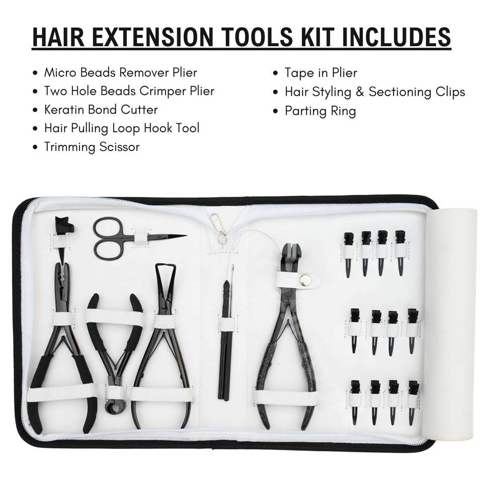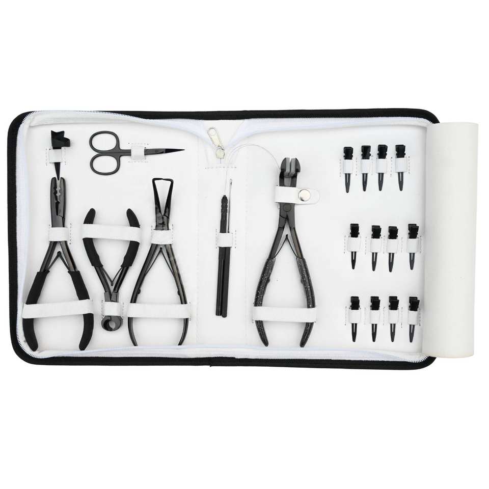 Kit d'application d'extensions capillaires avec pince à sertir les micro-anneaux, outil de retrait des micro-anneaux, pince à extensions à bandes, coupe-keratine, pinces de sectionnement et étui