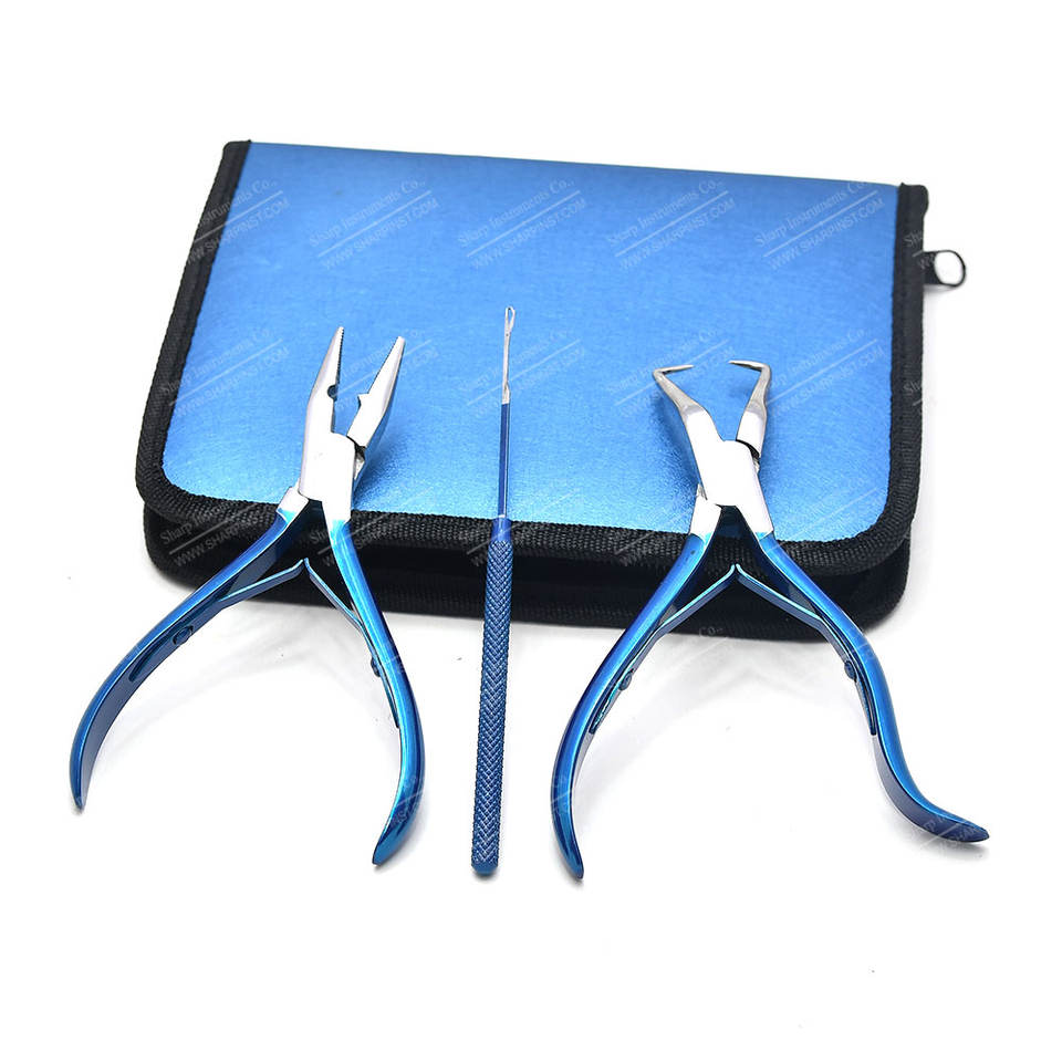 Le kit d'extension de cheveux en acier inoxydable Sharpinst de couleur bleu argent comprend un étui à fermeture éclair Rexine noir doux et un logo personnalisé