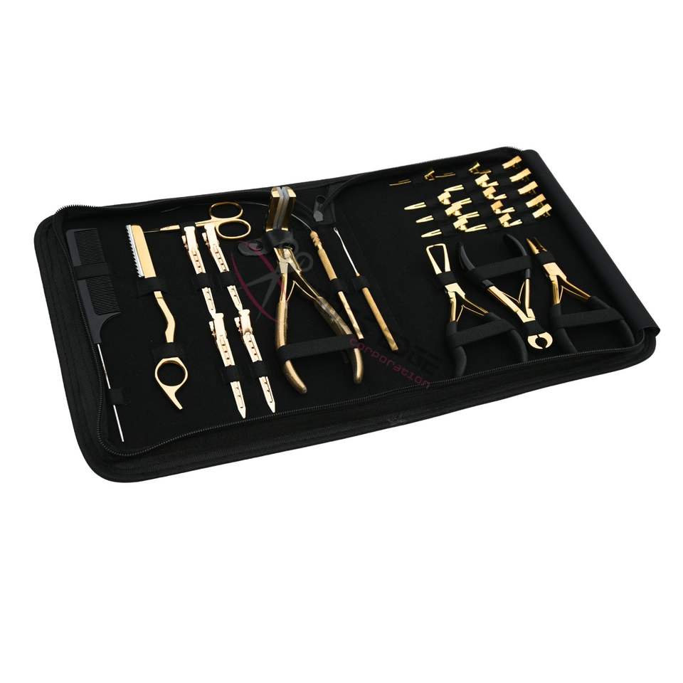 Outils professionnels pour extensions capillaires : Pince à bandes adhésives, Coupe-keratine, Pince à micro-anneaux, Ouvre-boucle, Couteau à boucles, Pinces bec de canard