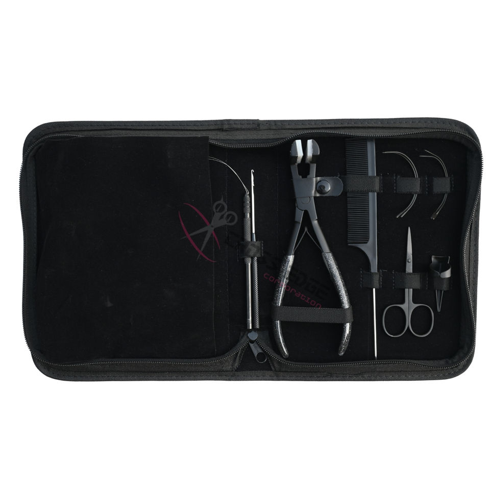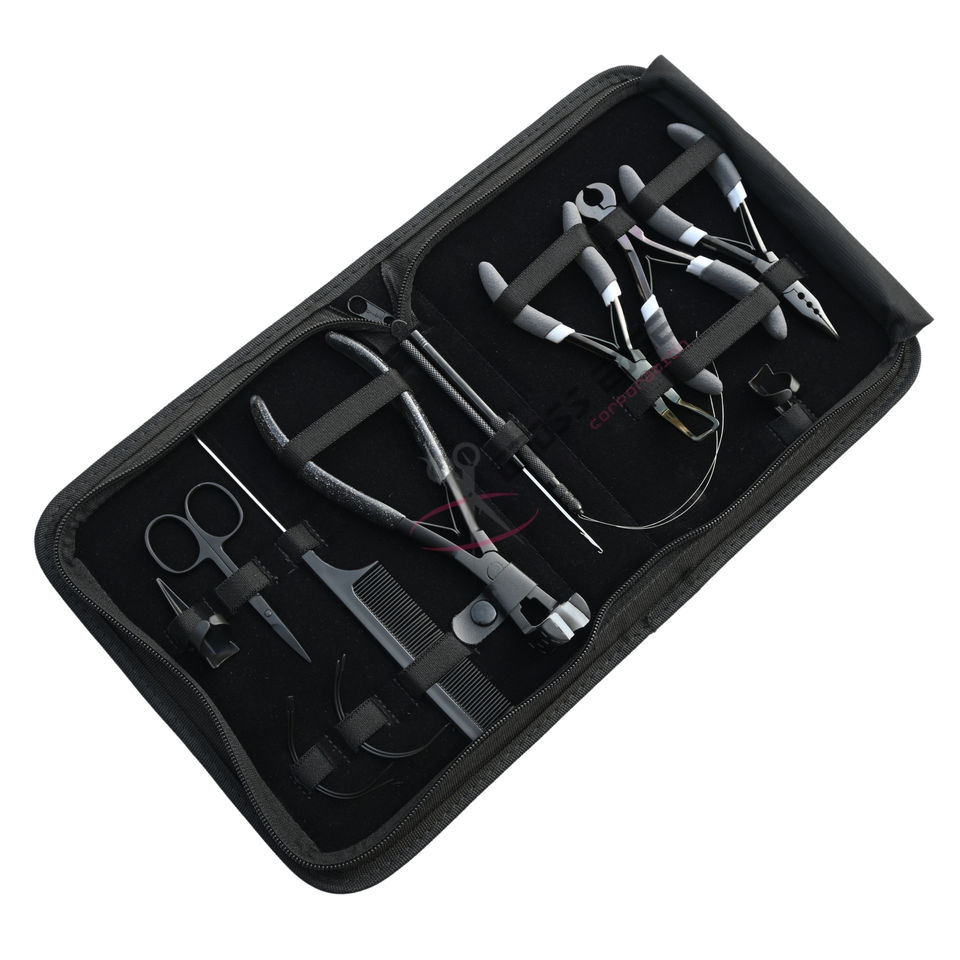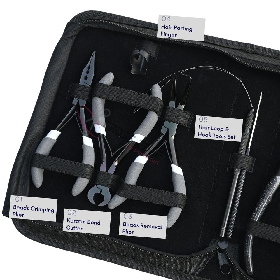 Kit d'outils pour extensions capillaires : Pince à bandes adhésives, Coupe-keratine, Dissolvant de micro-perles, Enfileur de boucles, Peigne à queue et Kit de doigts de séparation