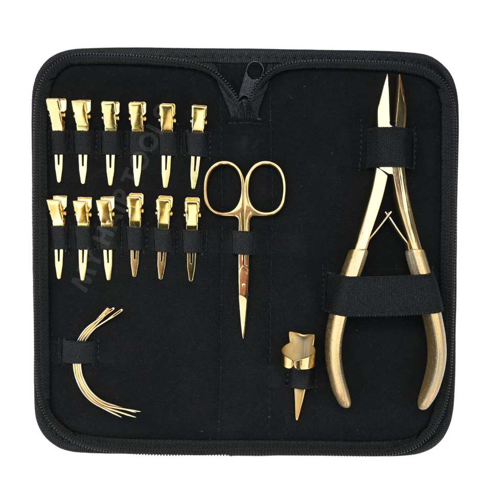 Kit d'outils pour extensions de cheveux dorées avec pince à sertir robuste à pointe plate