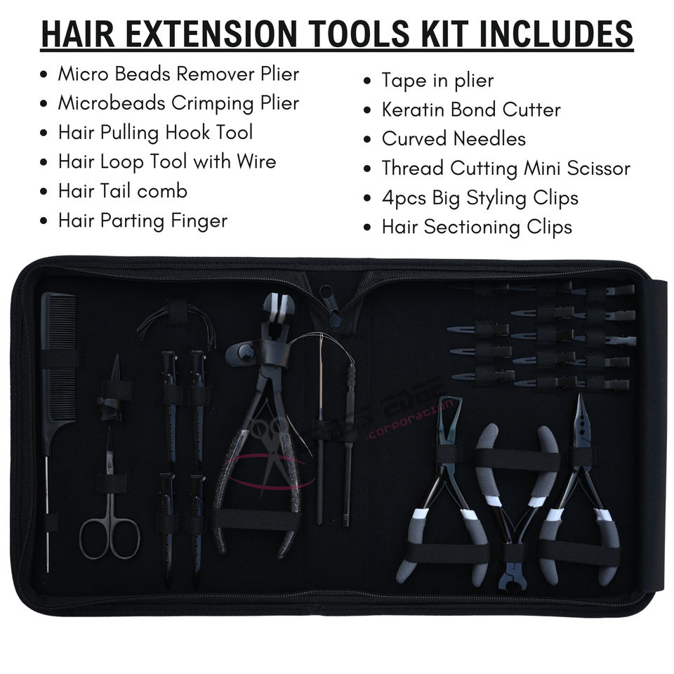Kit d'outils pour extensions capillaires : Pince à micro-perles, Pince à sertir, Crochet de tirage, Enfileur de boucles, Pince pour extensions à bandes, Coupe-adhésif, Aiguilles courbées