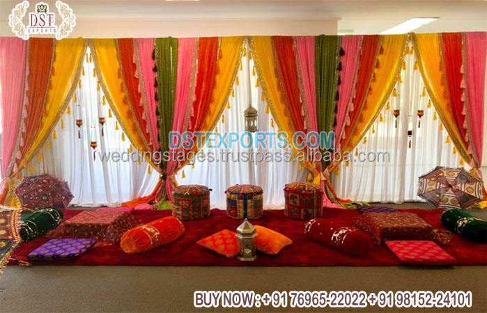 Rideau de fond de scène de mariage pour cérémonie Haldi, décor de scène de mariage élégant, rideau uni avec draperies pour mariage