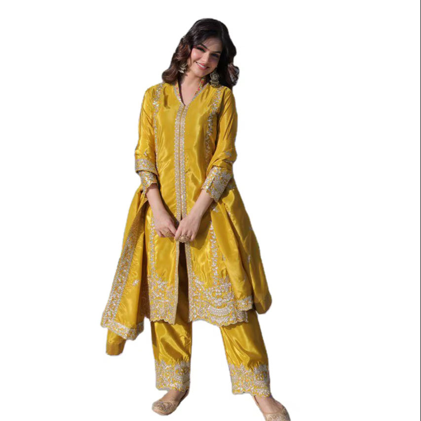 Salwar Kameez Traditionnel pour Mariée en Tissu de Soie Georgette Multicolore Brodé Spécial Fête de Mariage / Sangeet / Haldi Taille M XXL