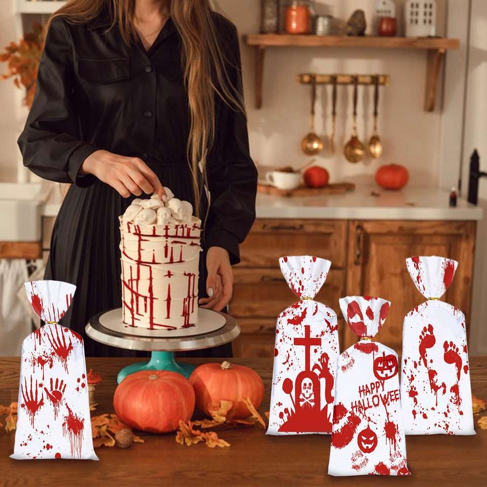 Halloween Bloody Hand Pumpkin Themed Cellophane Candy Goodie Bags with Twists Party Favors for Halloween Treats