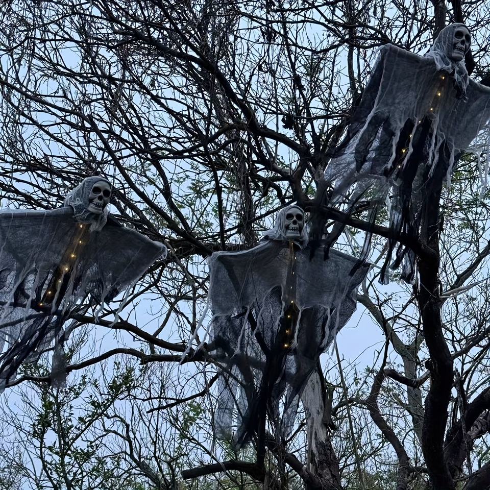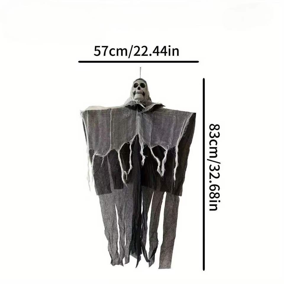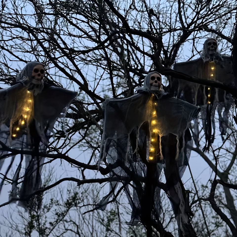 Lustre fantôme crâne lumineux à LED pour Halloween avec cape en gaze, décoration, idéal pour les fêtes et les décorations de maisons hantées.