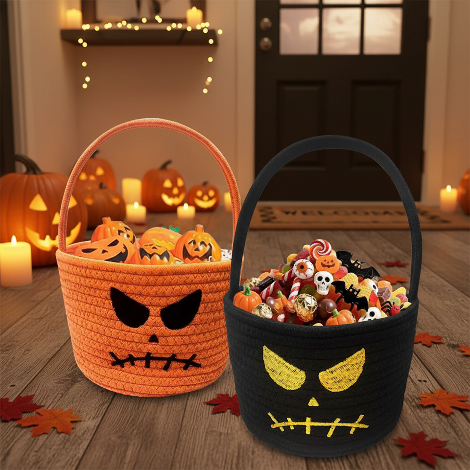 Panier de rangement en corde de coton tressé à la main, série Halloween, sac à bonbons pour enfants, sac citrouille, seau de bonbons pour Halloween
