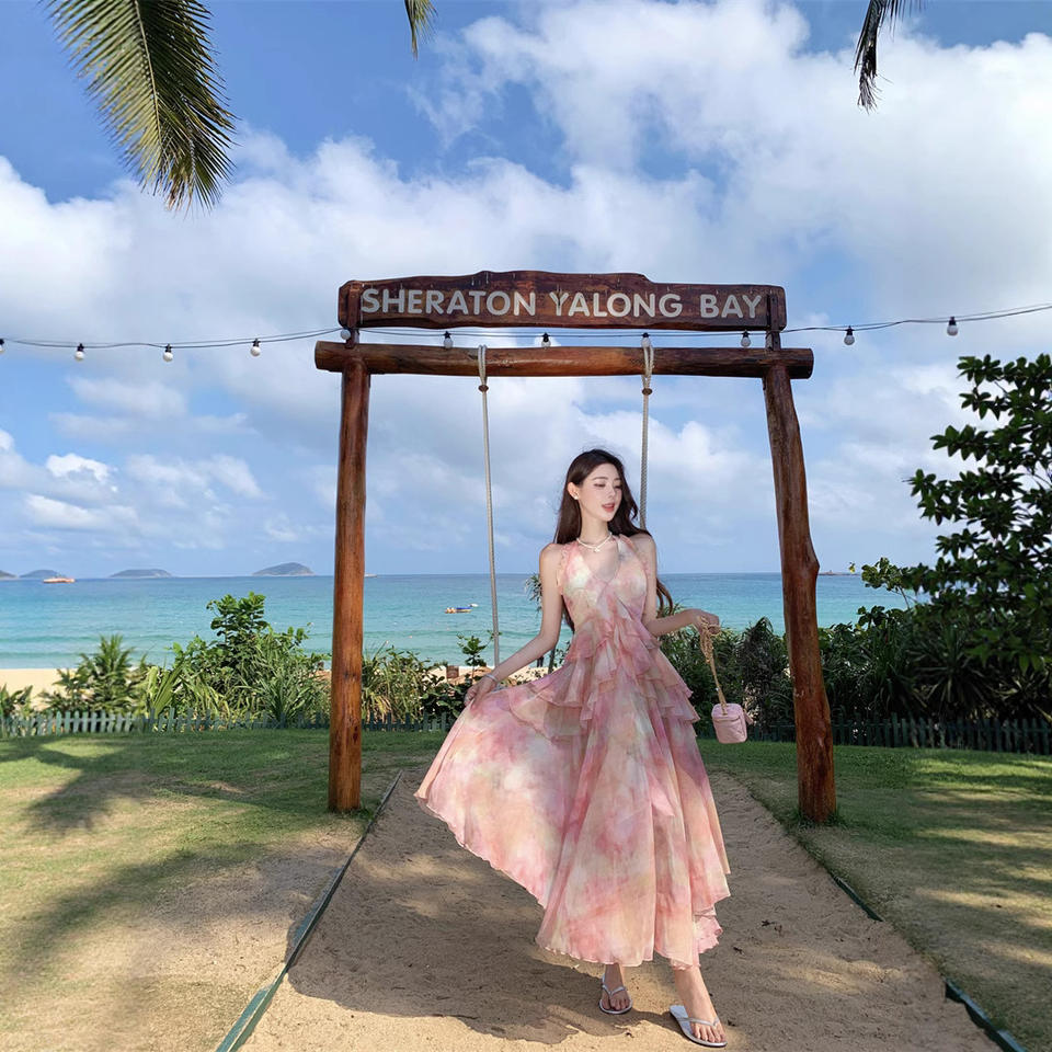 Robe longue d'été à col halter et dos nu, imprimé peinture à l'huile, taille empire, respirante, silhouette trapèze, en polyester/coton