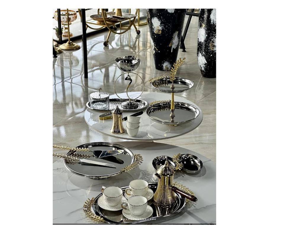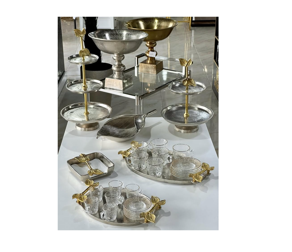 Hammer Under Glazed Dishes Brass Boarder With Floral Pattern Stainless Steel Trays bowls Tier stands and Dishes from India made