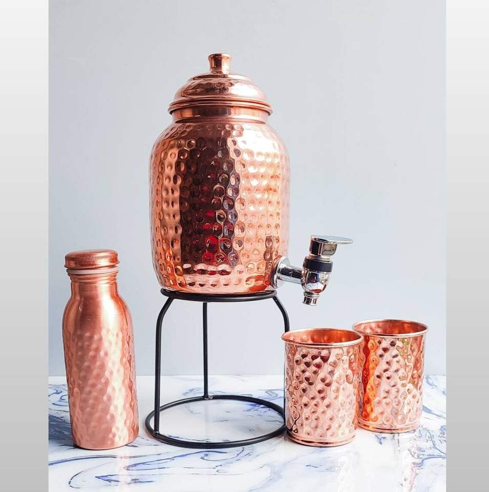 Ensemble distributeur d'eau en cuivre martelé avec support, robinet, bouteille et tasses – Vaisselle en cuivre pur pour la maison, la cuisine et l'hôtellerie