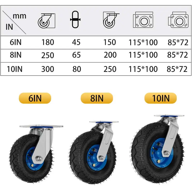 Roue pivotante pneumatique à air comprimé Hanak, capacité de charge de 150 kg, 6/8/10 pouces, pour brouettes