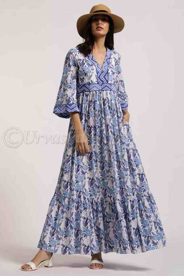 Robe en coton à imprimé floral fait main pour femmes, tenue décontractée ethnique avec bordure en zig-zag, col en V, tenue de soirée, robe à imprimé en bloc