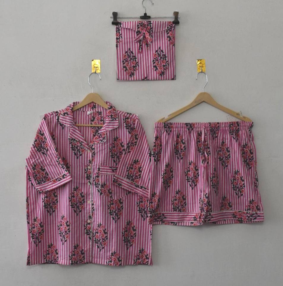Ensemble de pyjama élégant pour femmes en coton rayé rose et blanc imprimé à la main, vêtements de nuit, vêtements de détente pour l'été