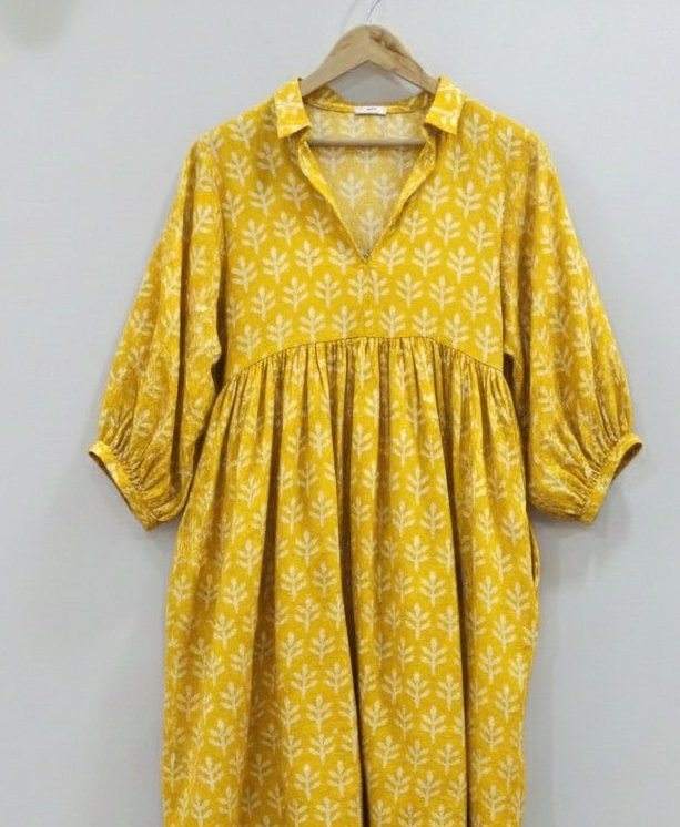 Robe midi formelle simple à col en V, 100% coton, imprimée à la main, écologique, respirante, à manches bouffantes, motif floral, taille naturelle, tie-dye