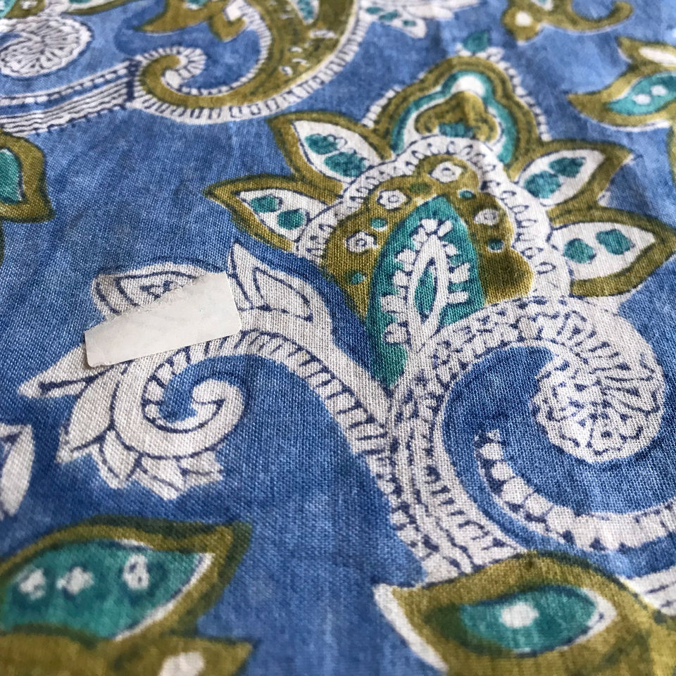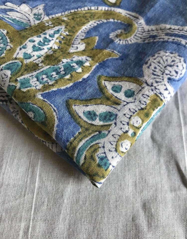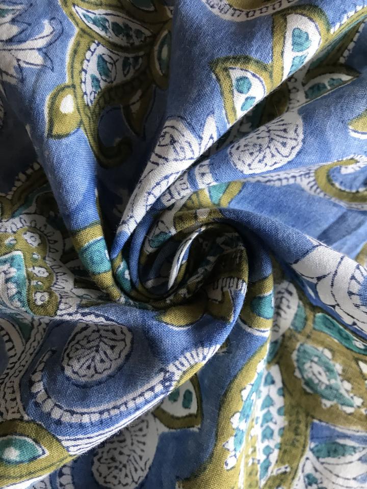 Tissu en coton imprimé à la main, motif floral paisley bleu olive | Textile ethnique indien