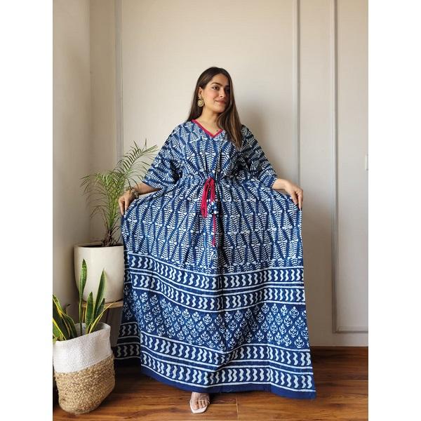 Kaftan en coton imprimé à la main, coupe ample et confortable, idéal pour l'été, imprimé ethnique élégant, parfait pour les tenues décontractées à la maison et autres occasions.