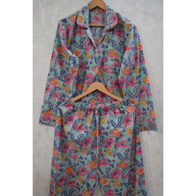 Ensemble de pyjama en coton imprimé à la main, luxueux, respirant, doux, pour l'été, motif floral indien, vêtement de nuit léger