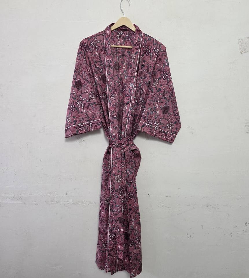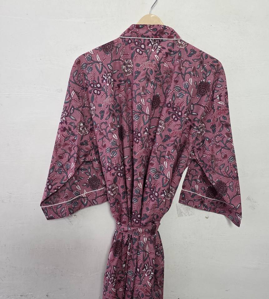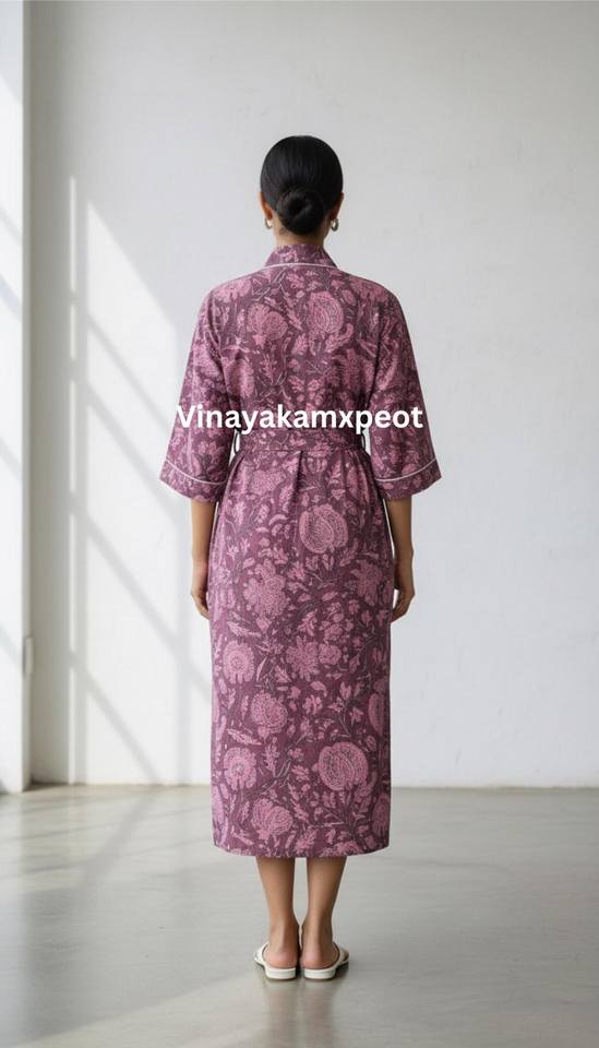 Robe Kimono en Coton Imprimé Floral Mauve 100% Coton, Peignoir Long Élégant avec Ceinture, Léger, Écologique et Respirant, Longueur Midi