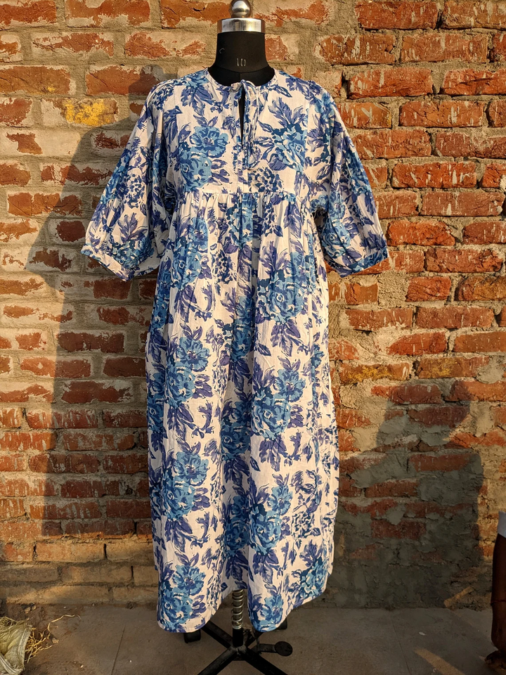 Robe maxi imprimée à la main pour l'été, en coton floral, faite à la main, durable pour l'automne
