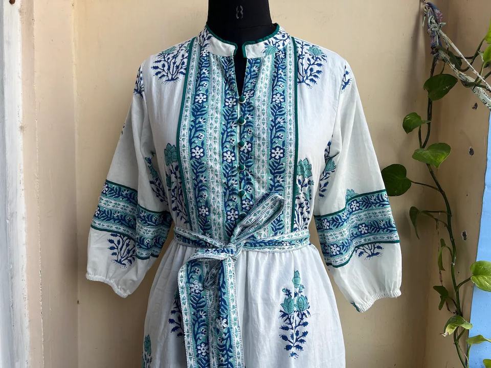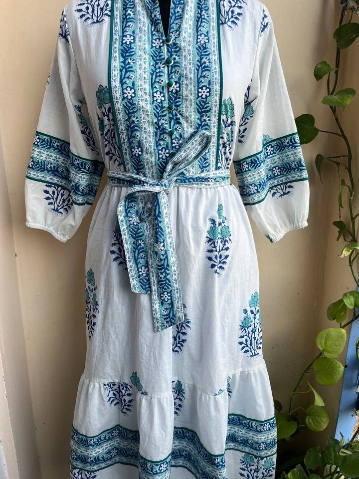 Robe midi imprimée à la main, blanche et bleue, en coton, motif floral Mughal, style décontracté d'été, longue robe maxi pour femmes