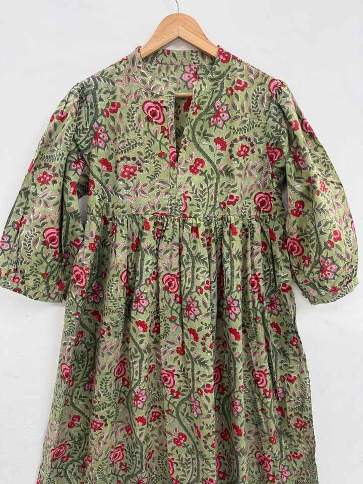 Robe maxi en coton à fleurs vert olive imprimée à la main Col en V Robe bohème