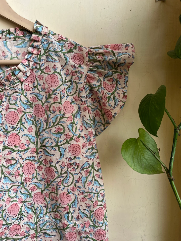 Robe courte à imprimé floral, col halter, manches courtes, style bohème pour femme, 100% coton, imprimée à la main, prix usine.