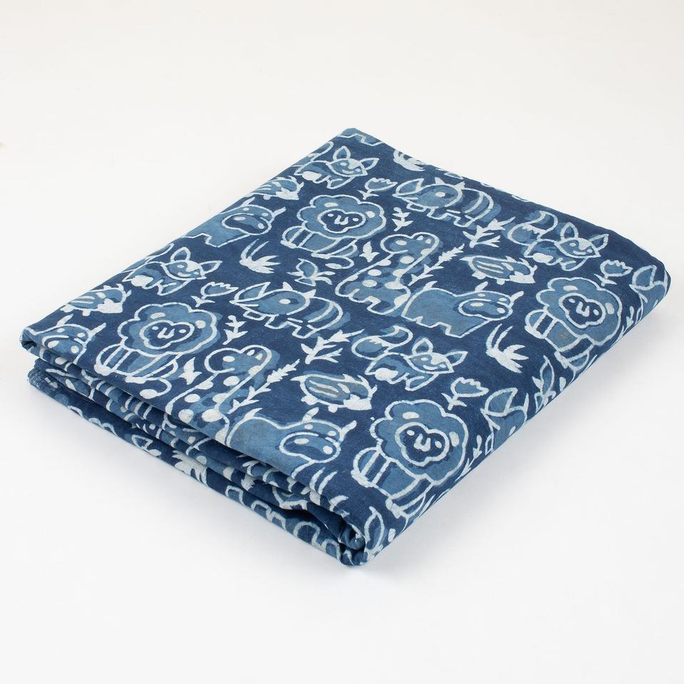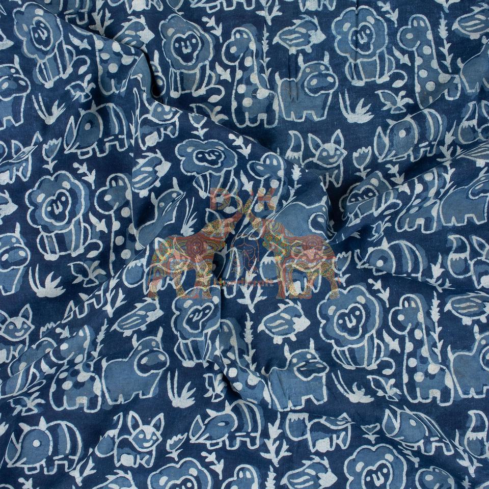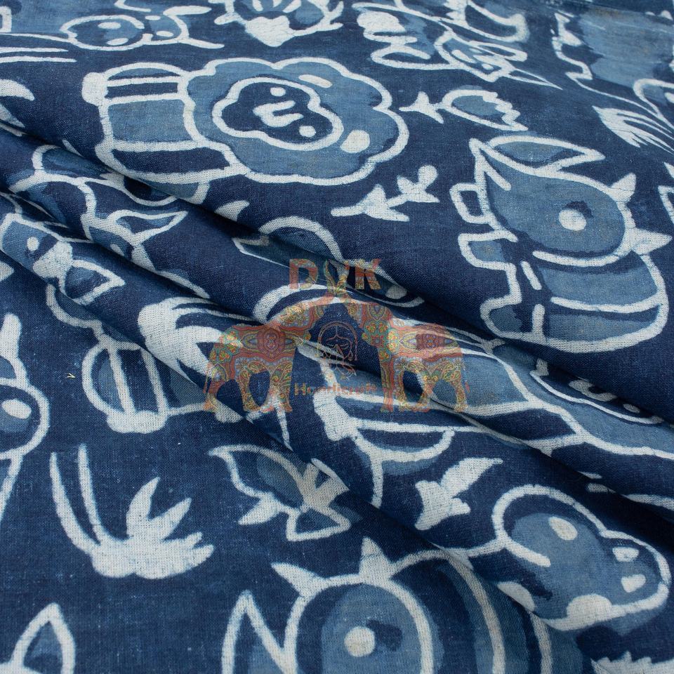 Tissu indigo élégant imprimé à la main avec des motifs d'animaux amusants, tissu élégant pour robes et vêtements