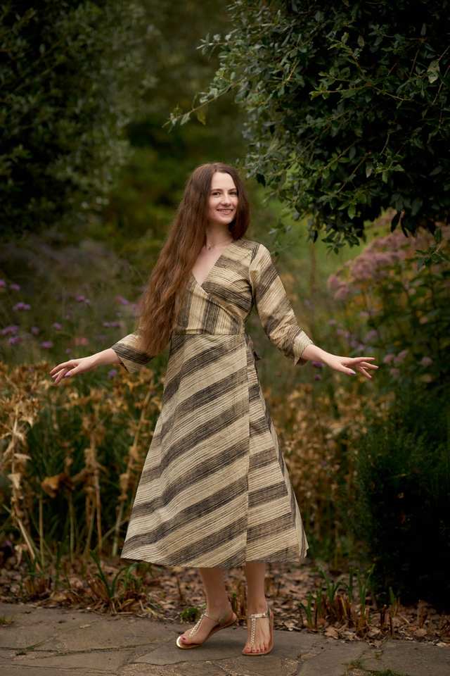 Hand Brush Printed Gandaki Wrap Dress Bohemian Brown Beige Casual Occasional Striped Pure Cotton Ethical Fashion