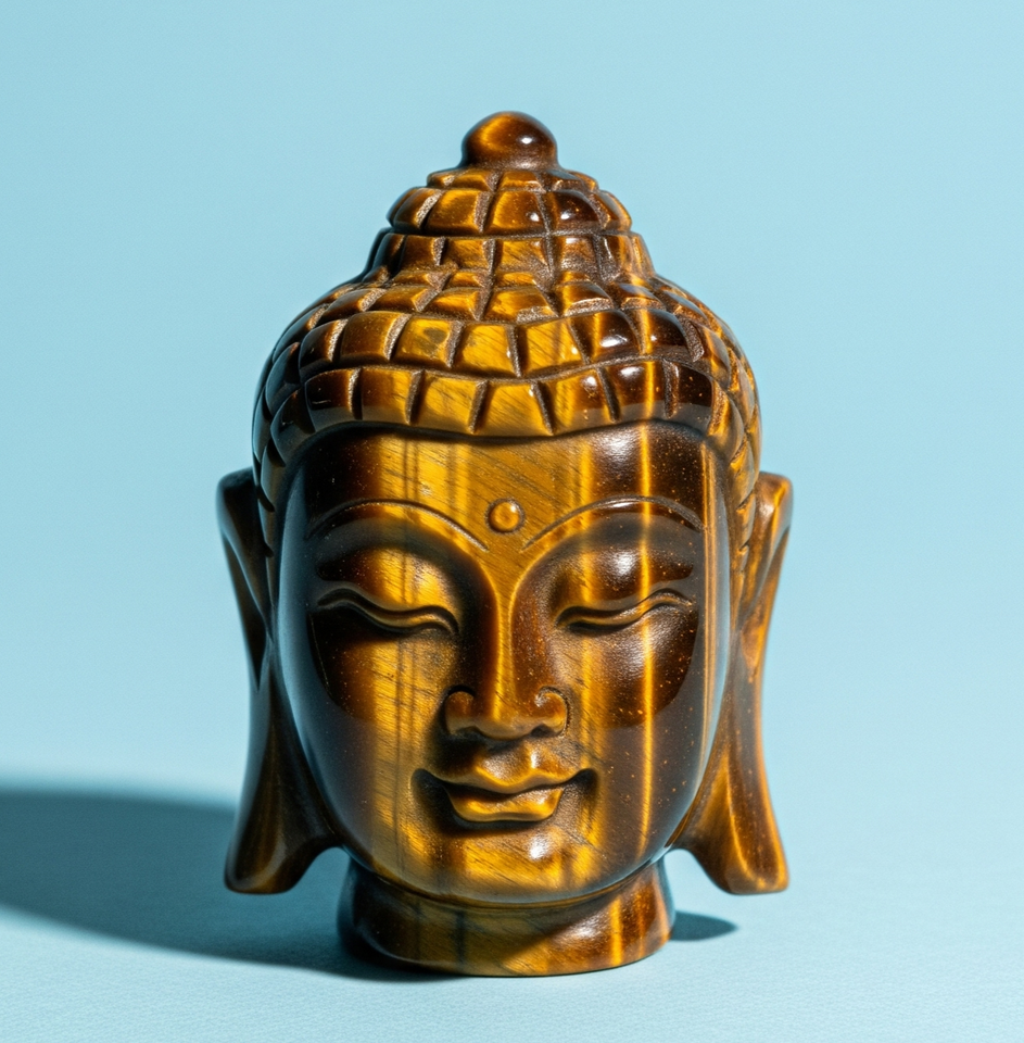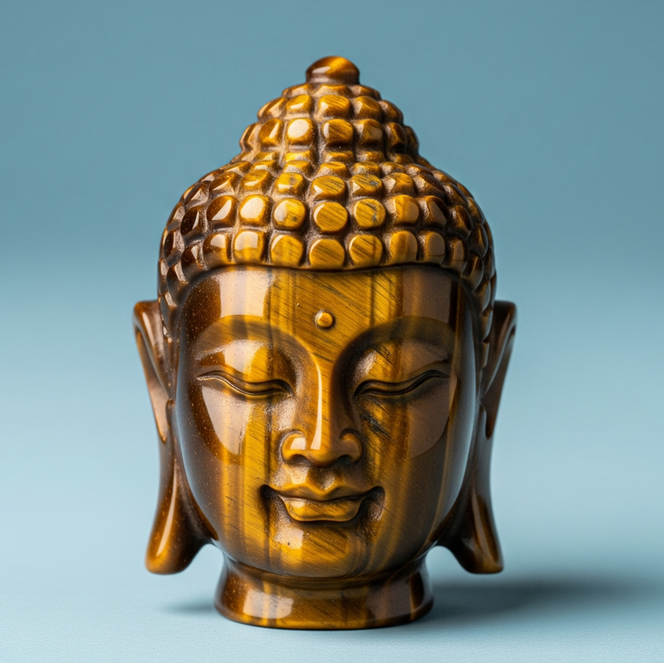 Hand-Carved Buddha Head Statue Figurine Indian Craft Engraved Business Gift with Tiger Eye Semi-Precious Gemstone Buddhism