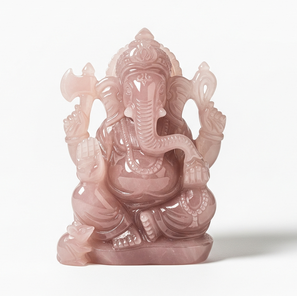 Hand-Carved Business Gift Ganesha Statue Figurine Rose Quartz Semi-Precious Gemstone Craft Engraved Made India Healing Crystal