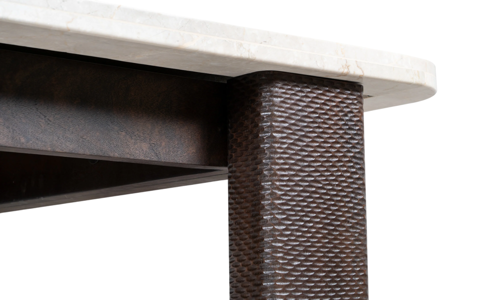 Table à manger de luxe en marbre Bottochino avec pieds entrelacés en bois d'acacia massif à motifs géométriques sculptés à la main