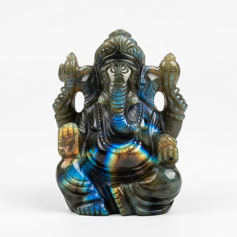 Hand-Carved Ganesha Statue Figurine Business Gift Labradorite Healing Crystal Made India Semi-Precious Stone Craft Engraved