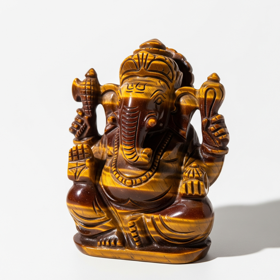 Hand-Carved Ganesha Statue Figurine with Tiger Eye Business Gift Indian Craft Engraved Semi-Precious Healing Crystal From India