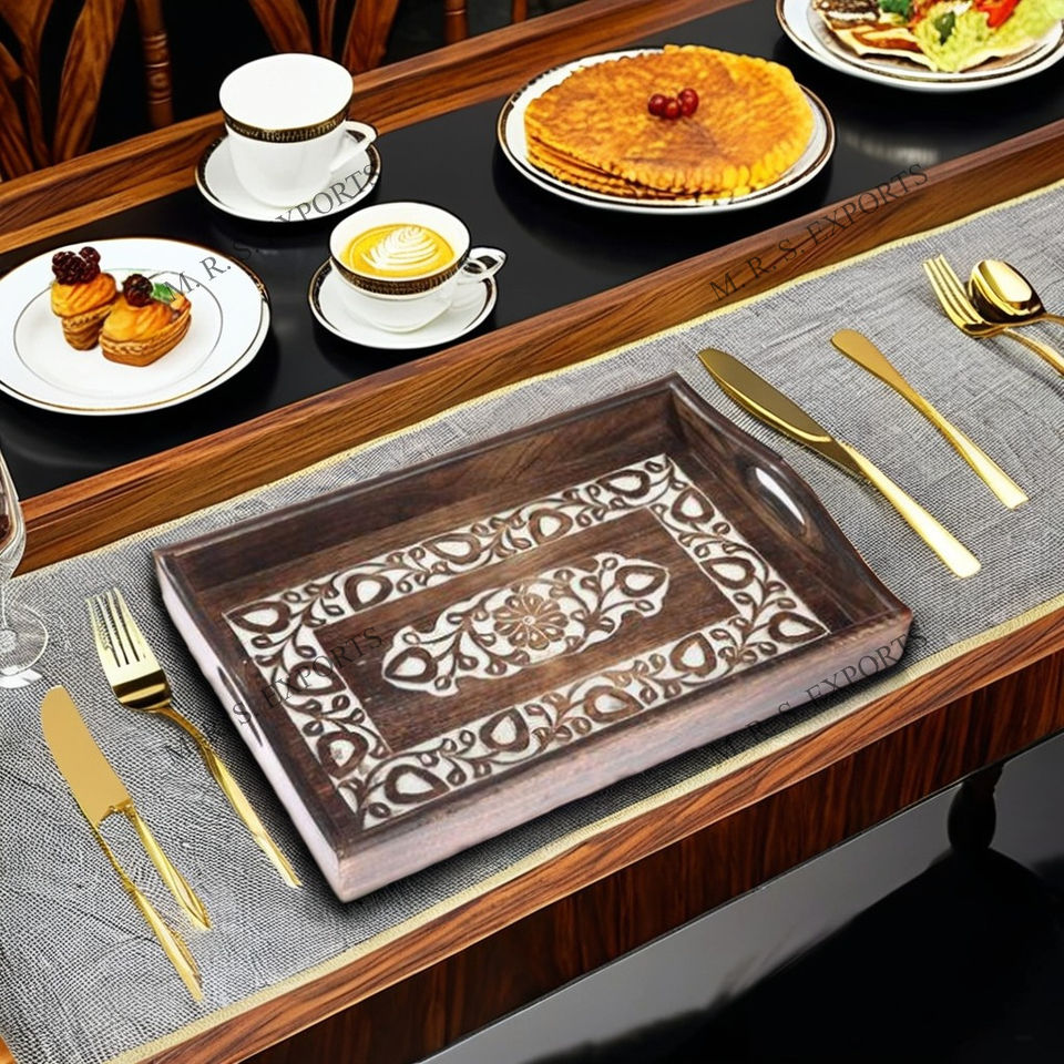 Plateau de service en bois de manguier sculpté à la main exquis pour un divertissement luxueux, une décoration de maison de taille personnalisée et une table à manger gastronomique