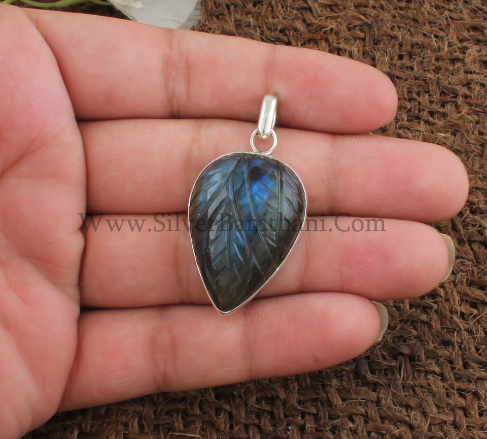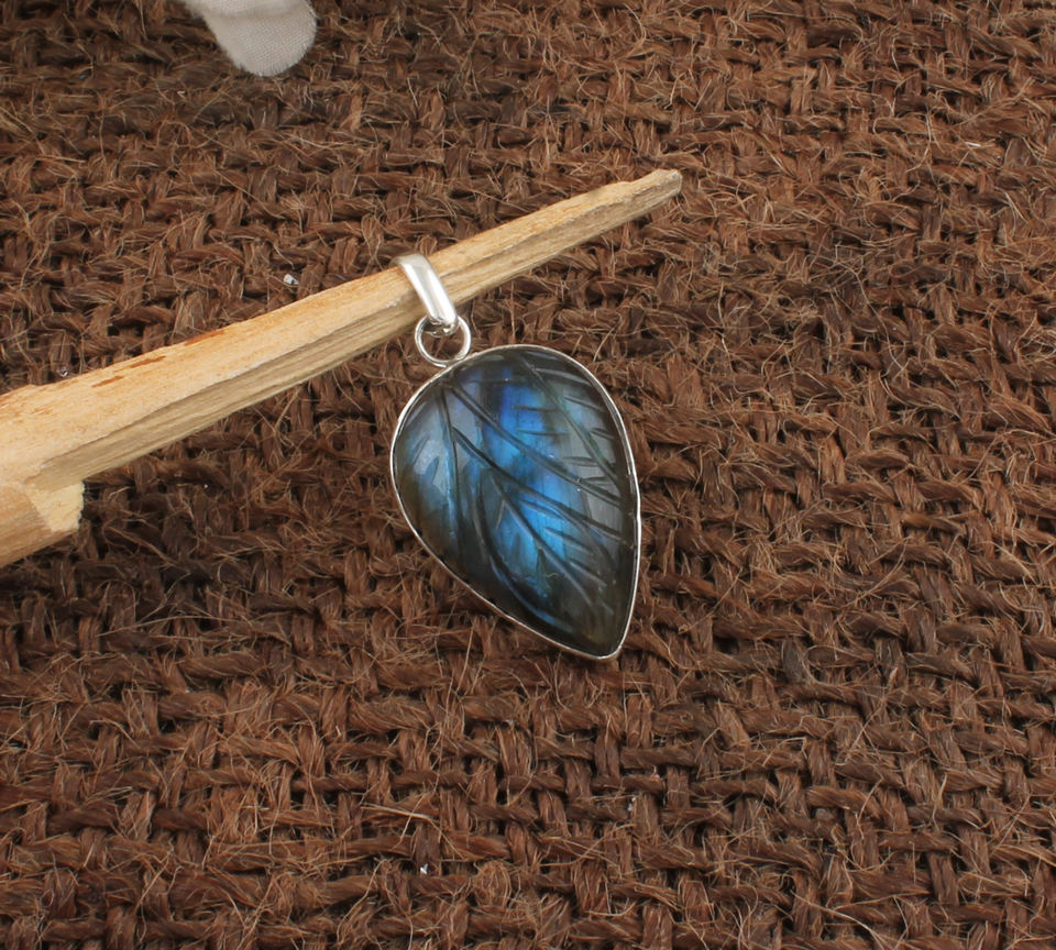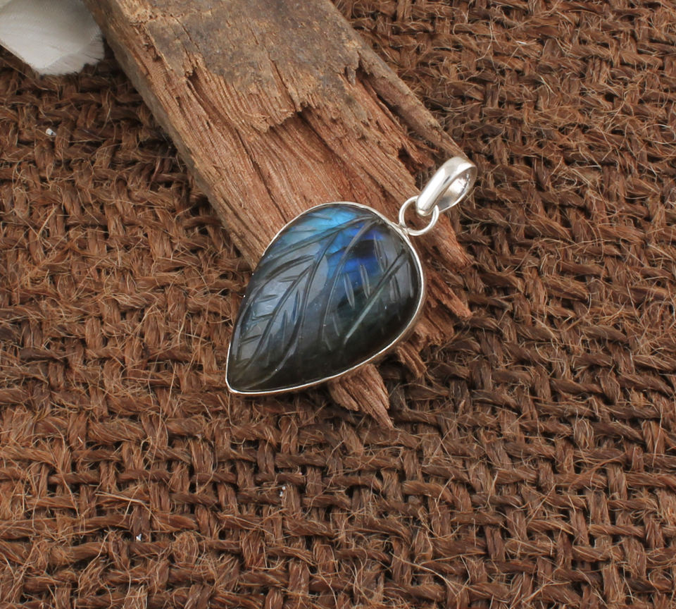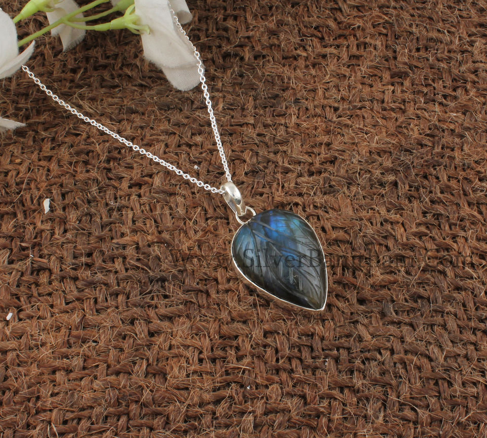 Pendentif Poire Vintage en Labradorite Naturelle Sculptée à la Main, Collier Goutte d'Eau à Éclat Bleu, Bijoux en Argent Sterling 925, Fabrication Artisanale