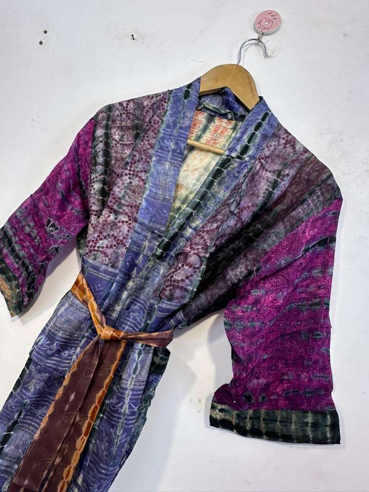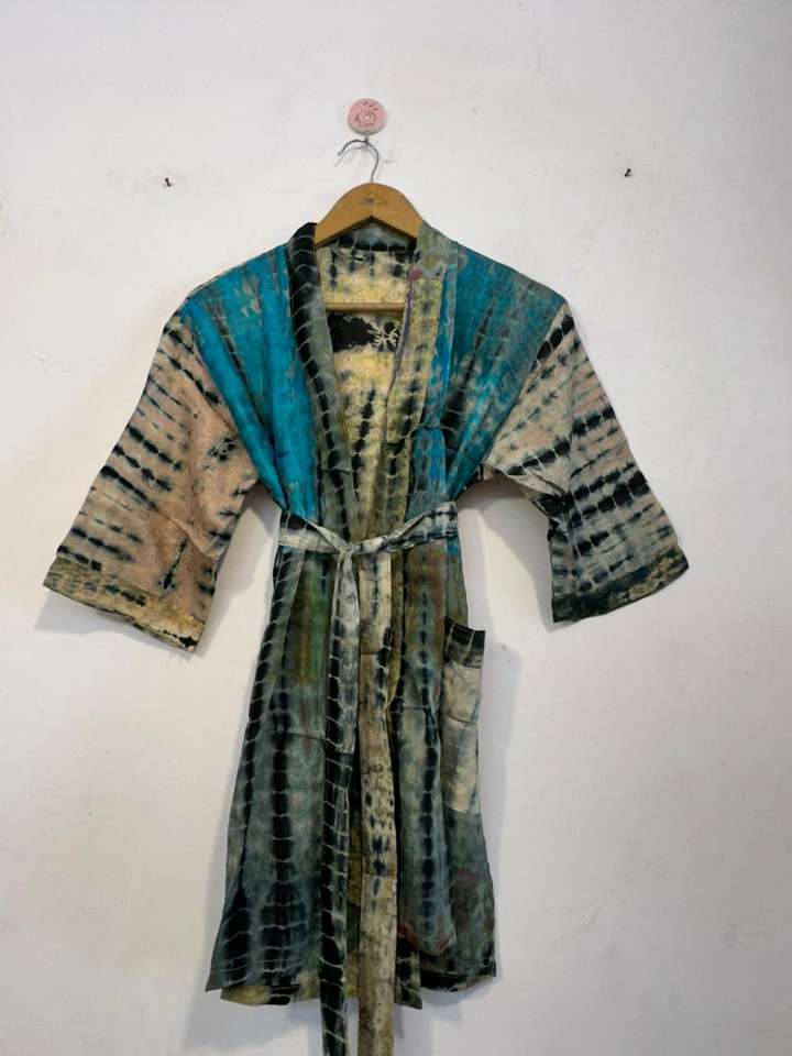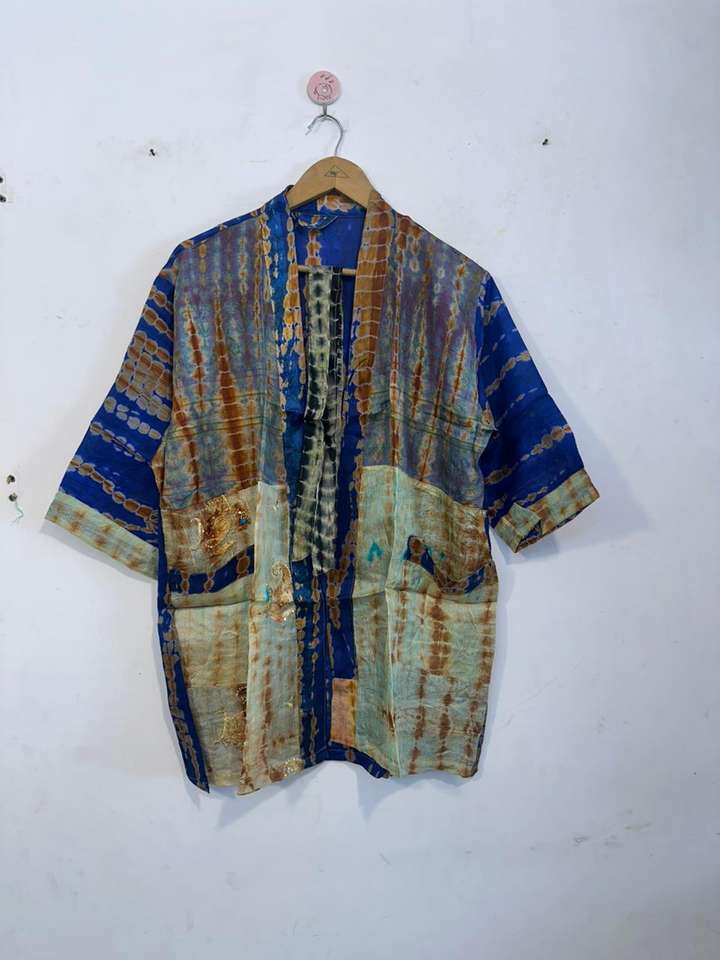 Robe kimono en soie teinte à la main, style bohème, patchwork, pour l'été et le printemps, vêtement de plage léger, soie pure, vintage