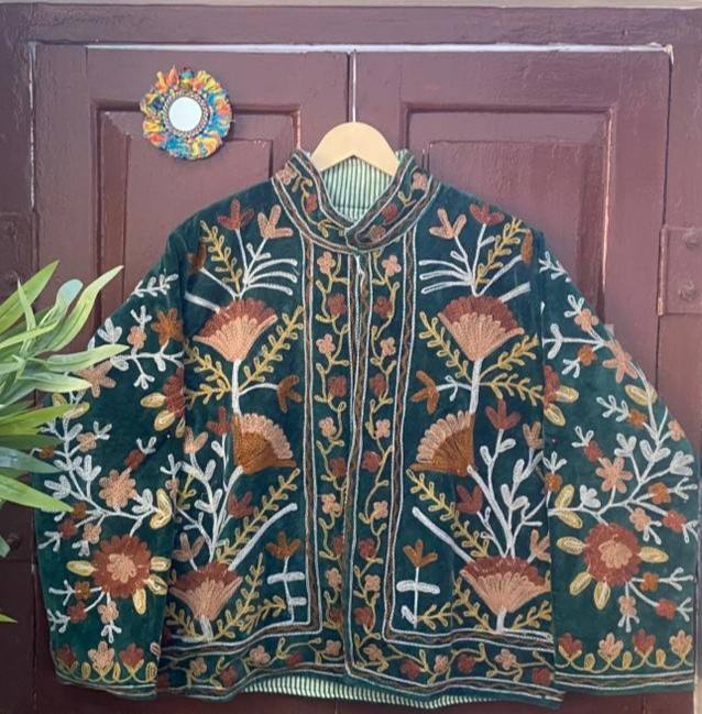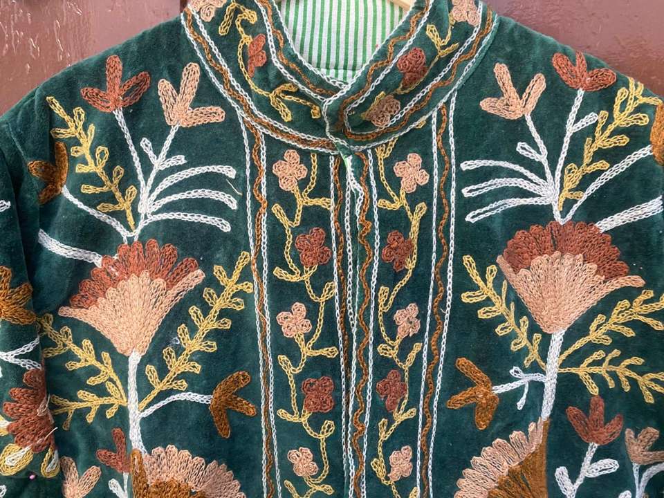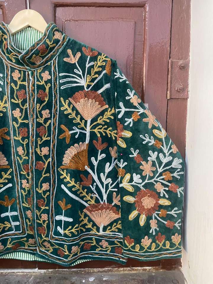 Veste en velours vert brodée à la main, style Suzani, motif floral traditionnel, style bohème, pour festival.